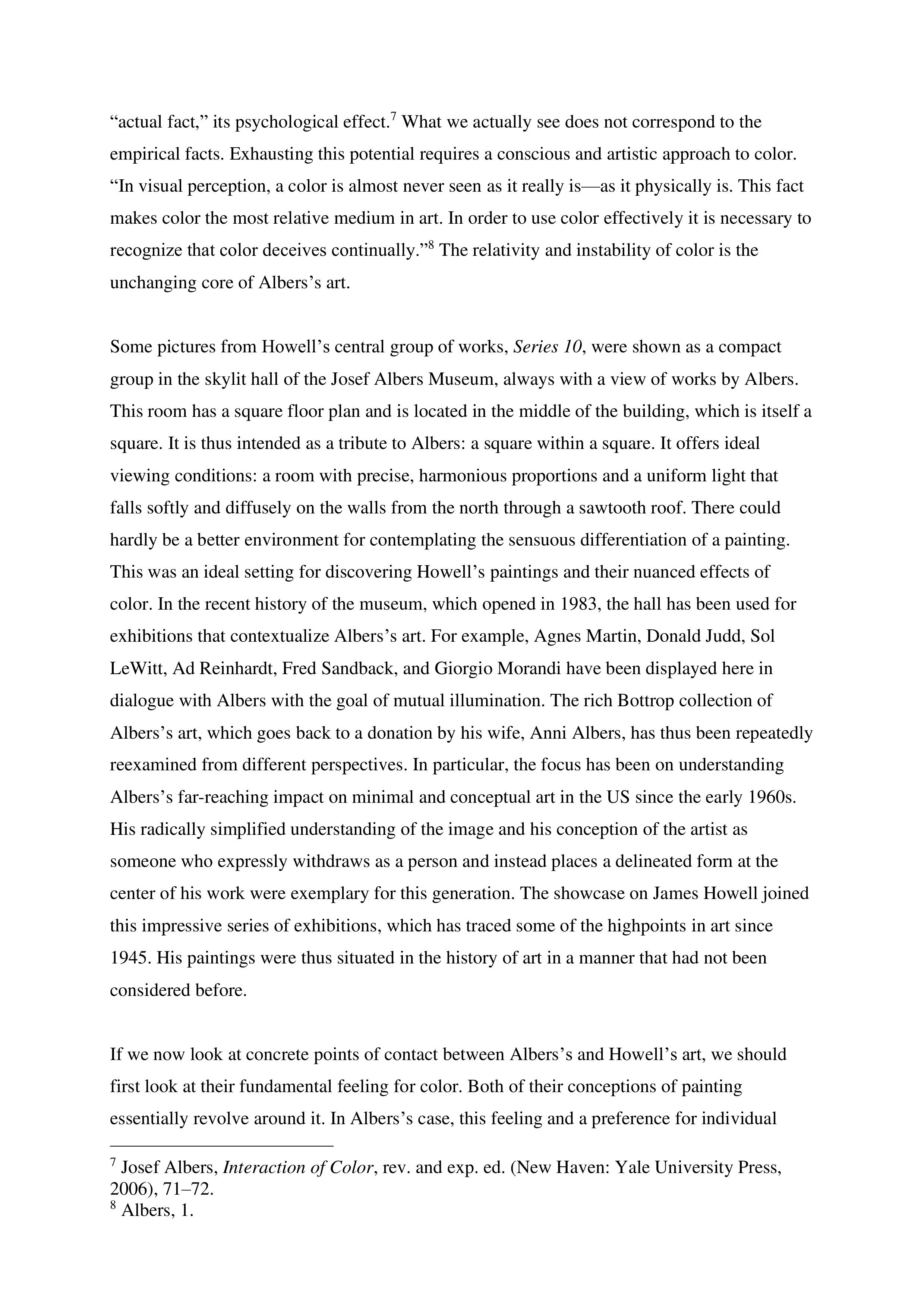 The Josef Albers Museum Quadrat Bottrop, located in Bottrop, Germany, is the only museum in Europe dedicated exclusively to the work and legacy of Josef Albers. Situated within the Quadrat complex—a cultural center combining museum, archive, and research facilities—the institution presents a rigorous program of exhibitions focused on modern and contemporary abstraction. In addition to stewarding the largest collection of Albers’s work outside the United States, the museum fosters scholarly research and international dialogue around color theory, perception, and geometric form. Through its curatorial initiatives and publications, the Josef Albers Museum plays a central role in advancing the understanding of postwar abstraction within a global context.